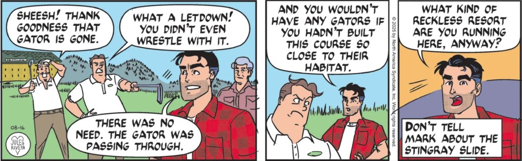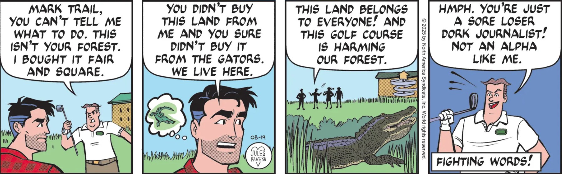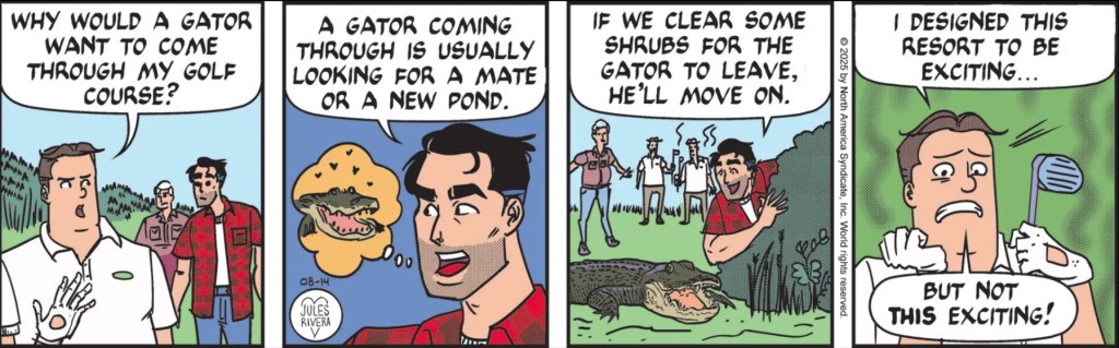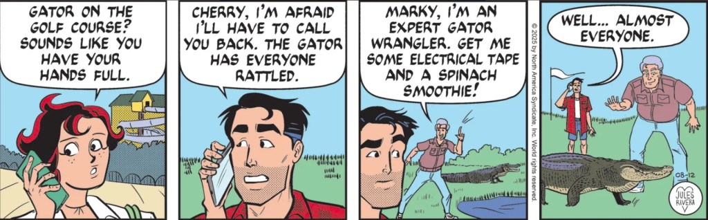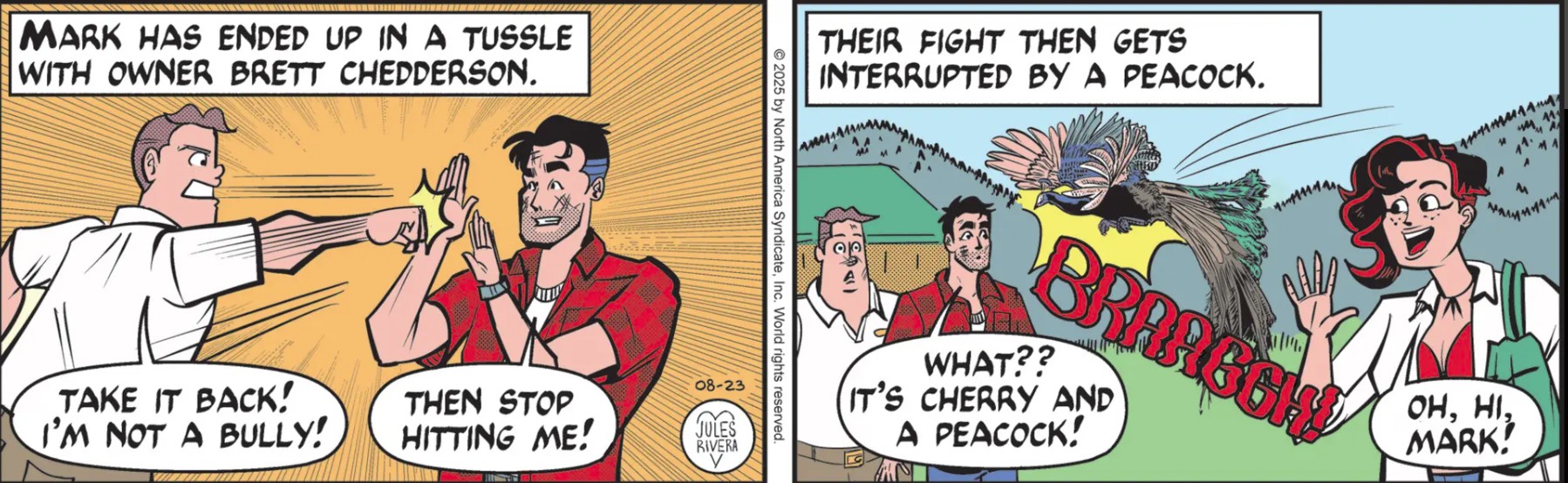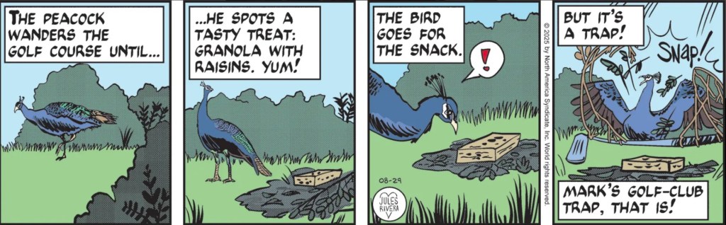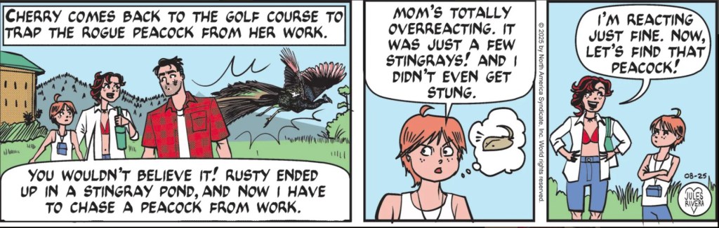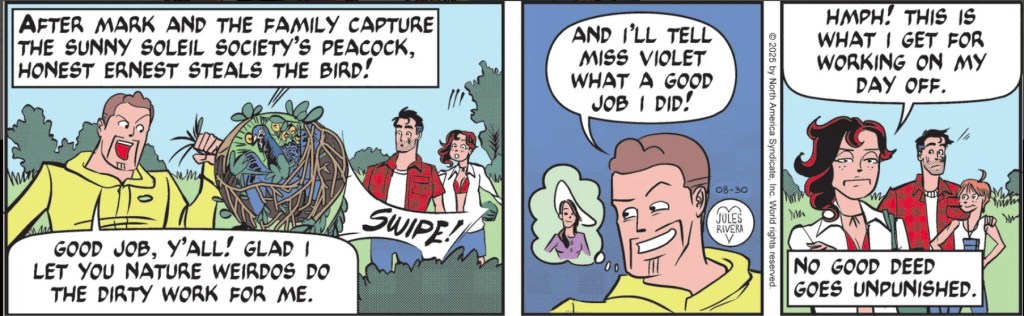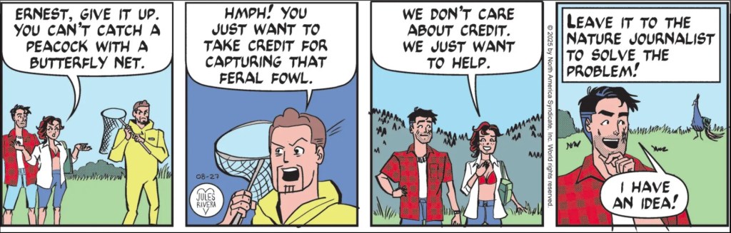 The only thing I’ll add is that Rivera may be throwing us a curveball. The peacock shown and trapped this week did not exhibit the long tail that the (male) peacock originally displayed. Either Rivera forgot that “subtle” distinction when she drew the bird or she is playing off the fact that there are “feral” peacocks loose in this country. So it is possible that they trapped the wrong bird (a female in this case) which will backfire when Honest Ernest returns it and claims credit. This could be the best ending yet for one of Cherry’s stories.
