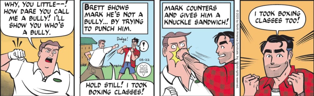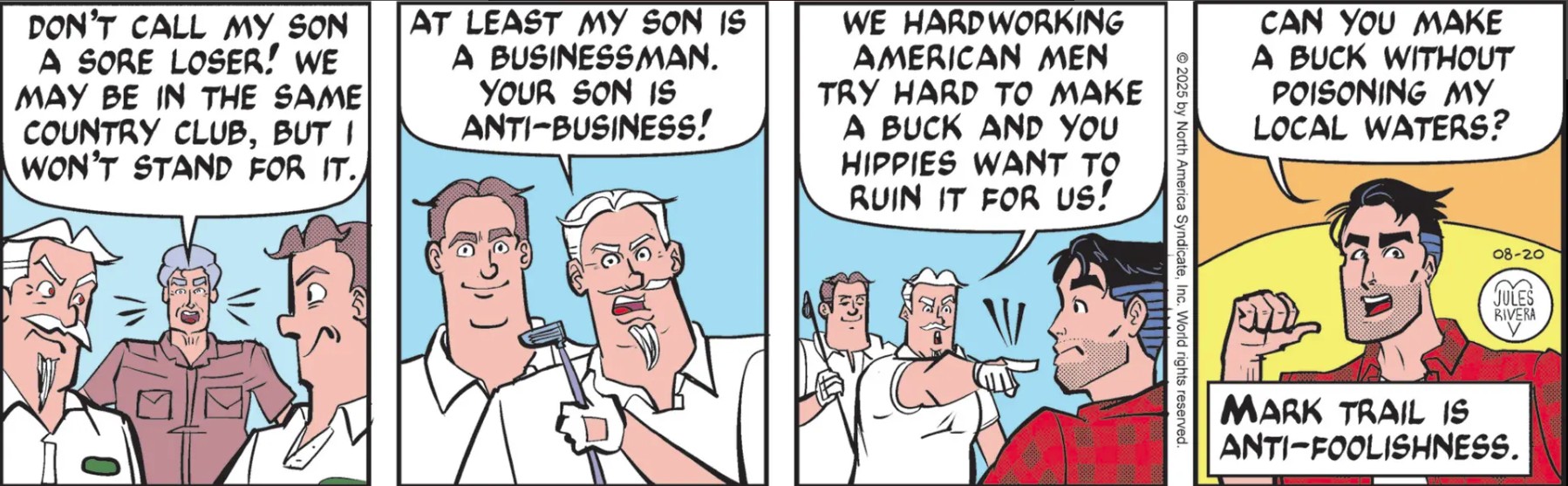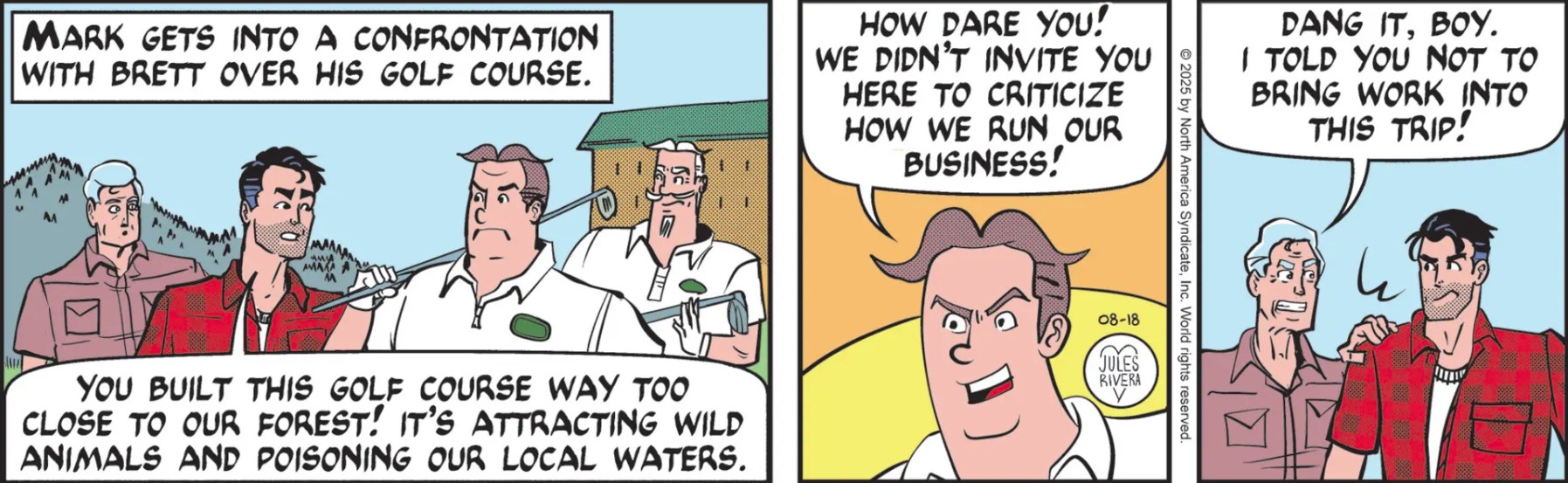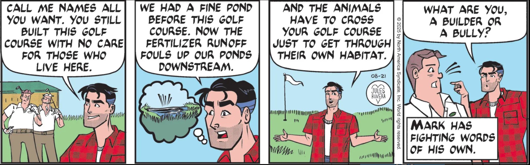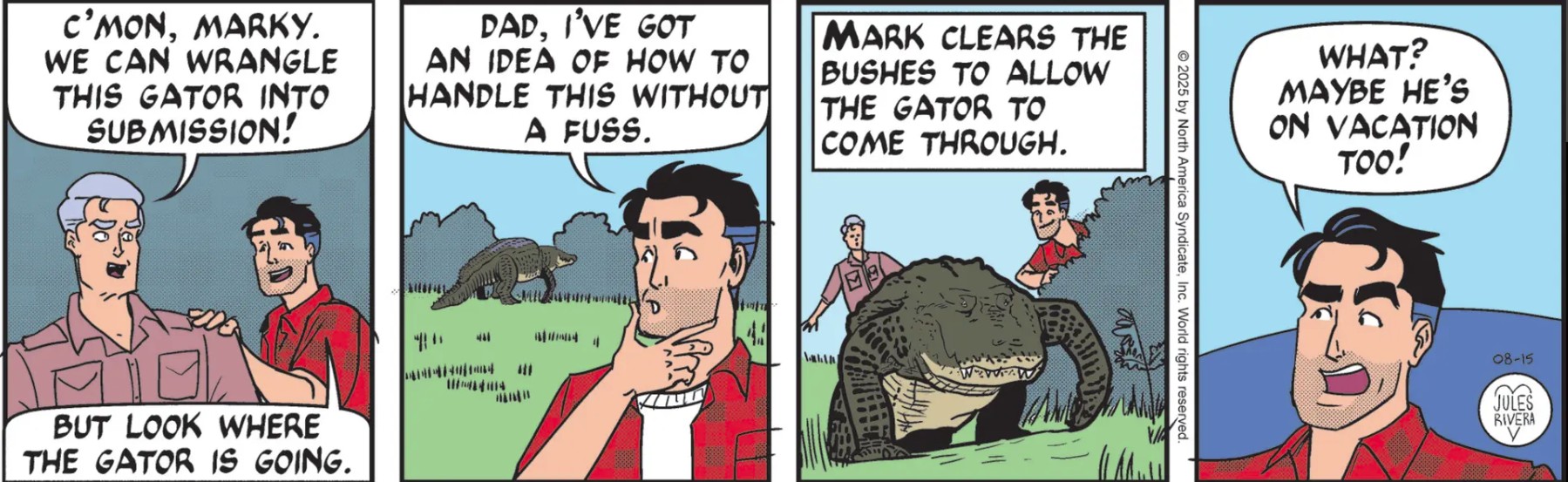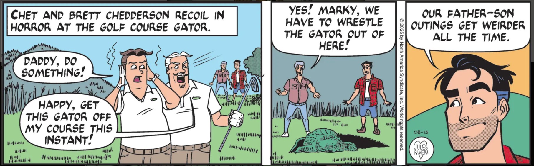 The only thing I’ll add is that Rivera may be throwing us a curveball. The peacock shown and trapped this week did not exhibit the long tail that the (male) peacock originally displayed. Either Rivera forgot that “subtle” distinction when she drew the bird or she is playing off the fact that there are “feral” peacocks loose in this country. So it is possible that they trapped the wrong bird (a female in this case) which will backfire when Honest Ernest returns it and claims credit. This could be the best ending yet for one of Cherry’s stories.