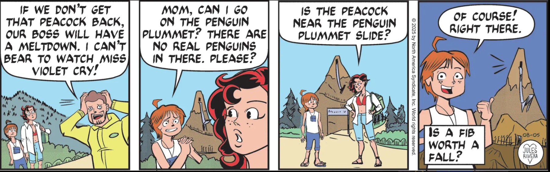I was amused by Honest Ernest’s panic attack in panel 1, as it brings a look of wide-eyed shock to Cherry; or maybe she reacts to how he refers to Violet as “Miss Violet.” That’s certainly an old-fashioned phrase that Cherry, herself, used from time to time in the early days of the strip when talking to Violet Cheshire (see the strips for 8/23/21 and 3/28/23). Yet, Ernest is only talking about Violet. Why refer to her that way, when Cherry knows her almost as well as he does. Don’t worry; I’m not going to deconstruct it. It probably means nothing.