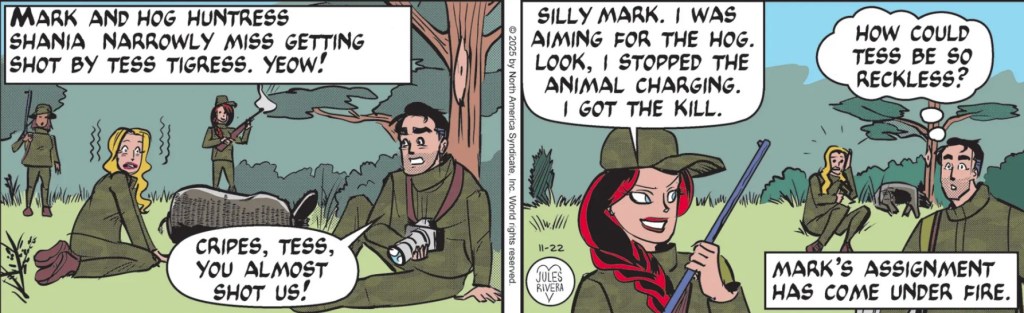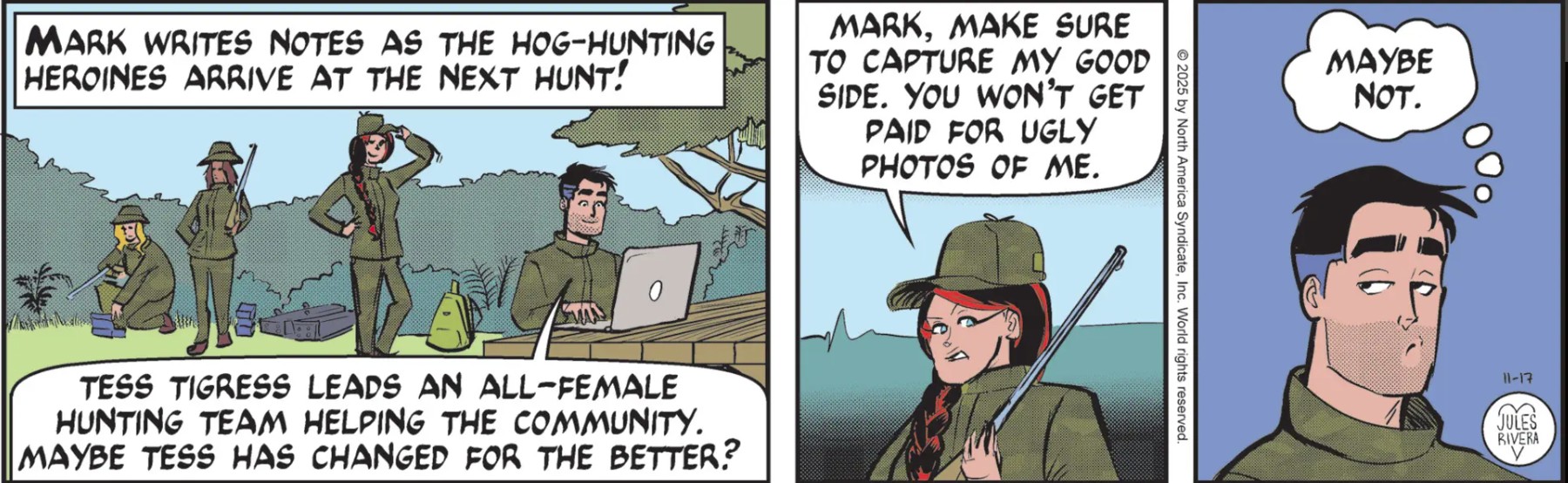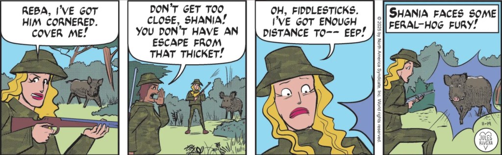 Having survived the afternoon hunt with the Hog Huntin’ Heroines (as published the week before), Mark began this week’s installment writing up his notes at the home of Jess and Tess. Mark pondered the implications of Tess’s “errant” rifle shot that came too close to him and Shania and wondered if Tess was getting careless. He didn’t consider that Tess might be leading up to a final confrontation.