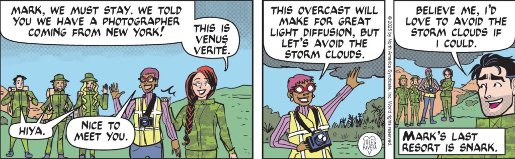 A point of weather depiction here: I can totally get behind the “overcast” look in panel 1, with the halftone applied across the upper sky. Very effective.