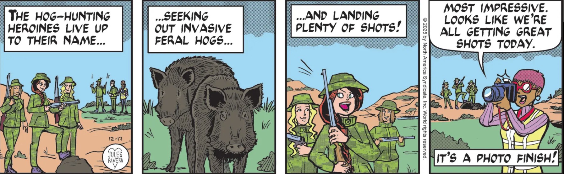 What makes a “Prize Hog”? Size? Tenacity? Skin color? Is there such as a thing as a prize feral hog? Well, I’m not sure where today’s installment fits into the story’s chronology. It could be before yesterday’s panels or just after. Makes little difference, perhaps. The story doesn’t really advance, so much as it just fills in a few miscellaneous spots. Mark is busy scribbling notes and not taking pics. Maybe he’s made a deal with Venus Verité to get copies of her photos. Say, I wonder if Shania and Reba actually got a chance to shoot?