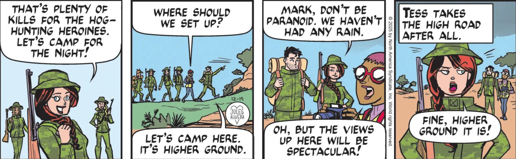 I reckon that if they didn’t talk so much, we’d have a better view of those storm clouds hiding behind the dialog balloons. At least some are peeking out in panel 4. Higher ground is usually a good strategy to follow in a situation like this, especially with a slight rise to assist in minimizing standing water. But what is this ground they are moving onto? It looks like clay or dirt, with no vegetation at all. Or is it rock? A dirt or clay ground probably would not be the best place to pitch tents in a storm.