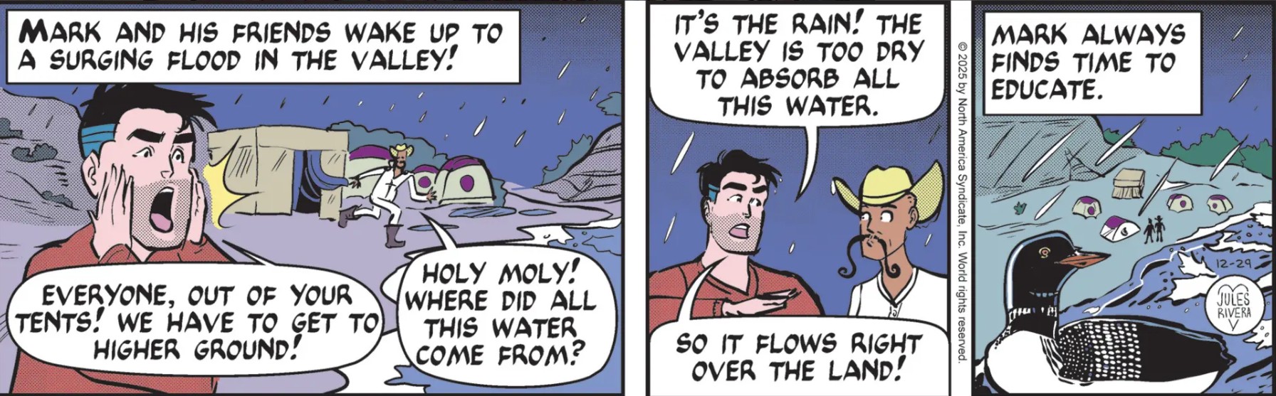 Next, who is Mark yelling at in panel 1? All the tents and people are behind him! Panic can make you do silly things. And what high ground is Mark referring to? Based on what Mark said earlier (December 19th), they are already camping on high ground! The only higher ground we can see is the big mountain behind them in panel 4. Like the low-volume rain, we have to remember that this is supposed to be drama, not a documentary. So I am probably wrong for trying to make sense of things that are irrelevant.