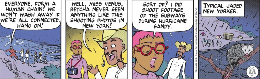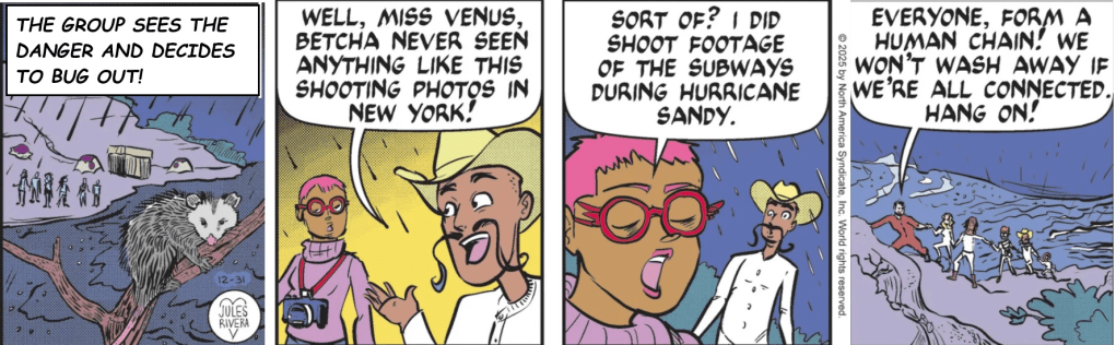 I’m not sure Mark’s logic in panel 1 is accurate. Whole chains of people certain can get washed away, depending on the circumstances. But it’s a good group psychological trick to minimize panic. And it is a shame that Jules Rivera again undercuts the drama and value of Mark’s advice by indulging in buffoonery in panels 2 and 3. A flash flood is a dangerous situation, a guaranteed bit of drama and suspense, made to order. So why piss on it?
