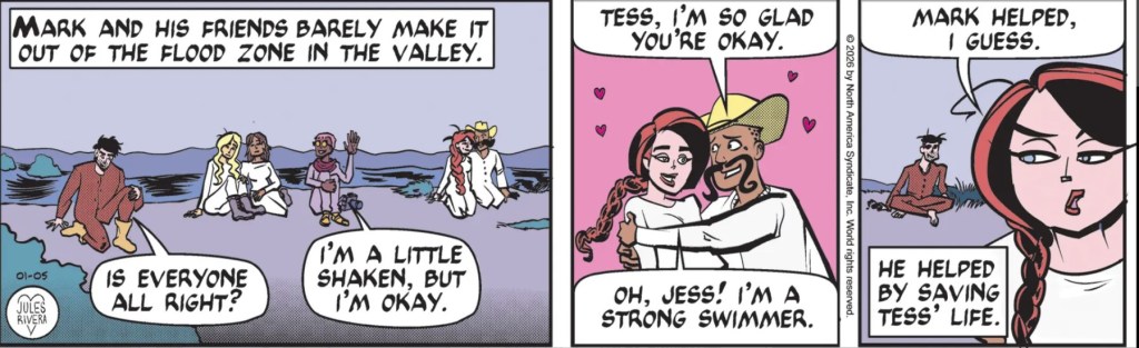 Yes, they are one sorry lot, indeed. Yet, they survived. I’m not sure they made it out of the flood zone if that is the floodwaters just behind them. Props to Jules Rivera, by the way; that’s sure one bedraggled Mark! It’s not clear if any of their equipment or transportation survived the flood; based on the topography, I would assume it has all been washed away or rendered useless.