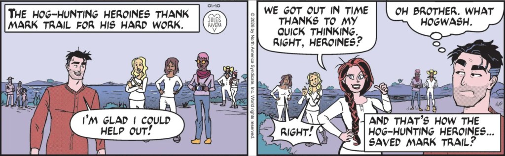 What are we to take from this flood disaster story, other than Tess’s narcissism and Mark’s pragmatic defeatism? Well, we got a flash flood story that downplayed any actual serious effects. Nobody was seriously in danger. Nobody died. No crop fields were destroyed. No animals lost their lives. Whatever property was destroyed or lost is simply ignored. Was there a widespread disaster or was it just the campground? That “river” of floodwater behind the group certainly suggests something much, much bigger. But that’s a subject for a different comic strip, perhaps. In short, Jules Rivera did a bit of disservice by treating the flood as just fodder for Mark in yet another contest of wills with the opponent of the month.
