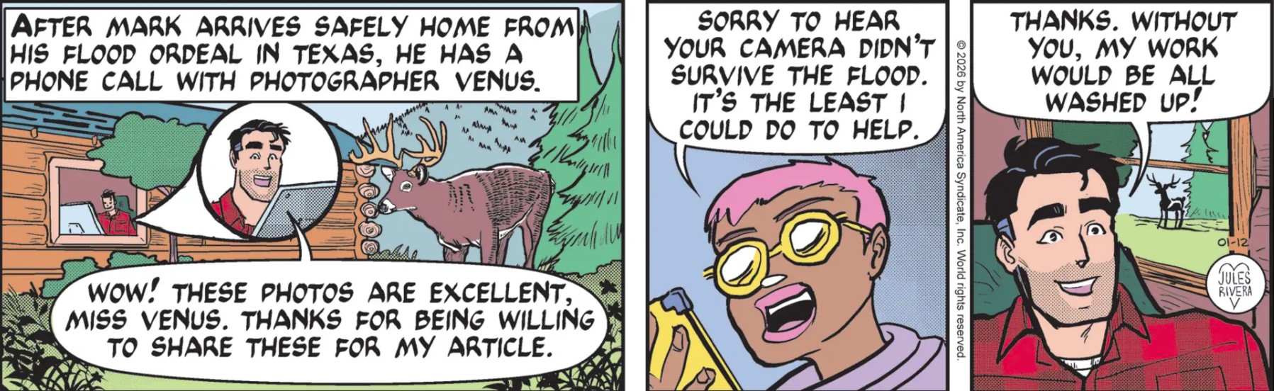 Art Dept. Rivera must have missed drawing Lost Forest, based on panel 1, where she stuffed in as many things as she could, except Ralph the Rat Snake. In spite of the crowding (or abundance), it’s mostly fine, with nice grass details in the foreground. But I continue to be disappointed at the slapdashery of the trees she inserts. Okay, I’ll admit it! I also think the close-up balloon mirroring Mark inside the cabin is excessive and unnecessary. But aside from all of that ….