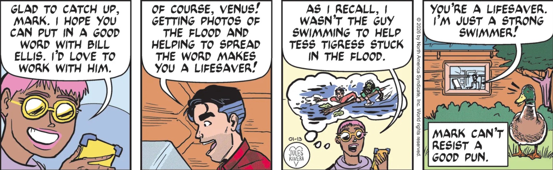 I might be slow but I don’t know what Mark is talking about with “spreading the word” in panel 2. Does he mean spreading the word about their flash flood, or about flash floods in general? I reckon he doesn’t mean spreading the word about the Hog Hunting Heroines. The less said, the better?