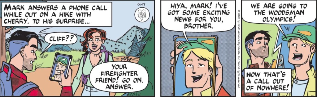 Well, this phone call is an interesting turn of events. Every so often, Mark gets involved in something that is not related to a Bill Ellis assignment. I believe the last time these two friends partnered up was when Mark launched his failed survival course for men (see “For Men Only” from 2024). So, going to the Woodsman Olympics sounds like a great time for Mark, but will he be a viewer or one of the contestants? And what kind of complications will rise up for Mark to resolve? There are always complications. And with all of the macho woodsmen destined to be there, it sounds like a time and place where Mark’s Two Fists o’ Justice might actually come in handy.