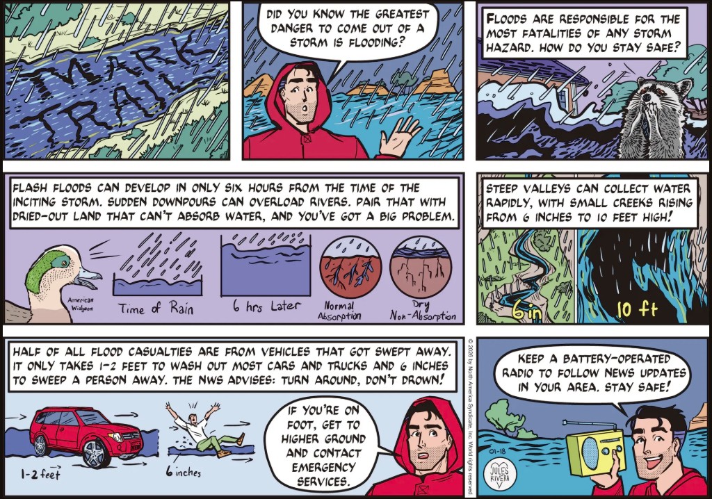 In spite of this useful information and Mark’s awareness of the impending flash flood, he didn’t seem very prepared when it came. I’d have thought he’d have some kind of emergency backpack at the ready. But he did get everybody to safety! Also, I’d recommend a radio that also offers a hand crank for power.