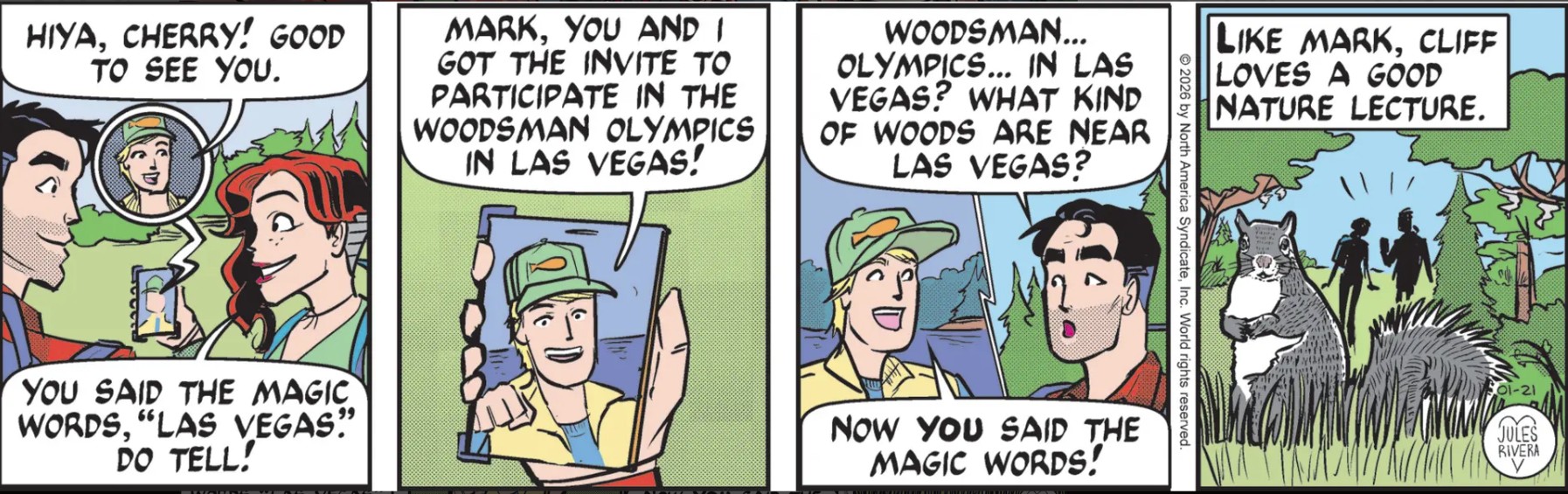 Mark and Cherry sure seem excited in panel 1! Just how many times is Cliff going to repeat the news about going to Las Vegas for a Woodsman Olympics? This is the third time in 4 strips.