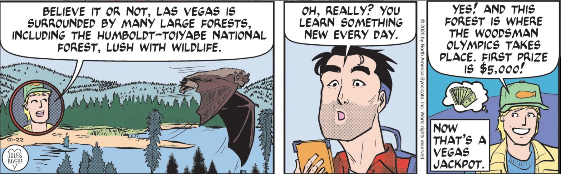 Las Vega is surrounded by large forests? Depends on what you claim is a forest, perhaps, and how expansive your concept of “surrounded” is. But I checked on this one. If Cliff and Mark think they can spend their days at the Woodsman Olympics and their nights in a casino on the Strip, they’re in for a big disappointment. The Humboldt-Toiyabe National Forest is 259 miles—about 4 ½ hours—northwest of Las Vegas. I would add that Cherry will have to enjoy her casino vacation on her own; but if she is going to play the slots, then it probably won’t matter. “Slots” players seem to have no idea what time or day it is when they sit down. Spouses, friends, and staff just show up at various times of the day to remind them of meal times and bedtime.