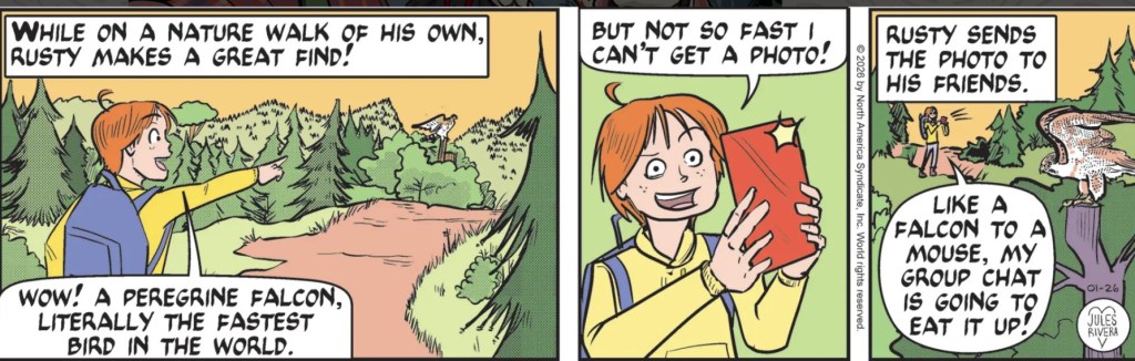 Awww, Rusty’s on a solo nature walk. Well, who knows, kid. If you want it, you may find a companion down the road to share some mutually satisfying nature walks, like your parents. On the other hand, if you keep looking like that freakazoid in panel 2, then Solitude may wind up as your best friend.