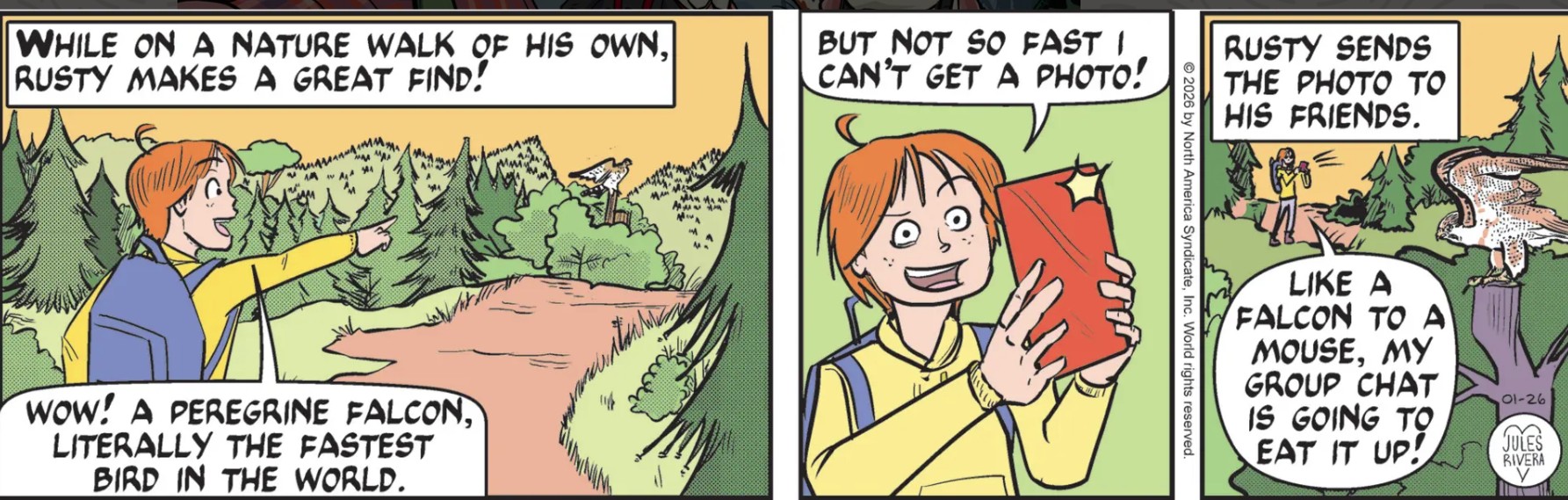 Awww, Rusty’s on a solo nature walk. Well, who knows, kid. If you want it, you may find a companion down the road to share some mutually satisfying nature walks, like your parents. On the other hand, if you keep looking like that freakazoid in panel 2, then Solitude may wind up as your best friend.