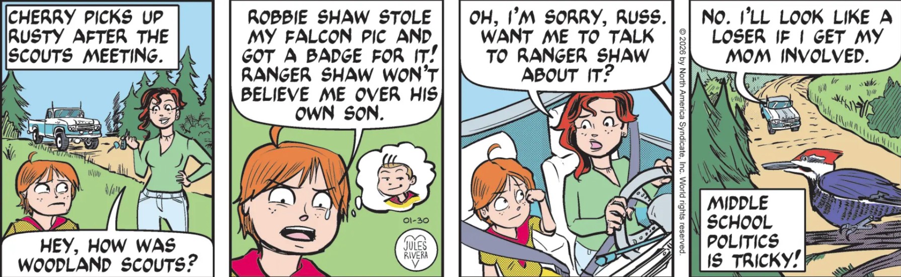 Do you think Rusty keeps looking younger? He’s supposed to be between 11 and 12, but looks more like he’s 9. Perhaps it’s the drawing. It looks more preliminary, unfinished; especially panel 3. I’d point you to the banner illustration at the top of this sit’s page as a comparison. It was drawn by Rivera when she first took over the strip back in 2020. But let’s face it:  The entire family looks different then, than they do today. It’s a constant reminder of how much Rivera has transformed the appearance of the Trails over these past 5 ½ years. Normally, characters in a strip evolve over time from somewhat sketchy, uncertain forms into more polished figures as cartoonists hit their stride. Rivera has clearly taken a different course.