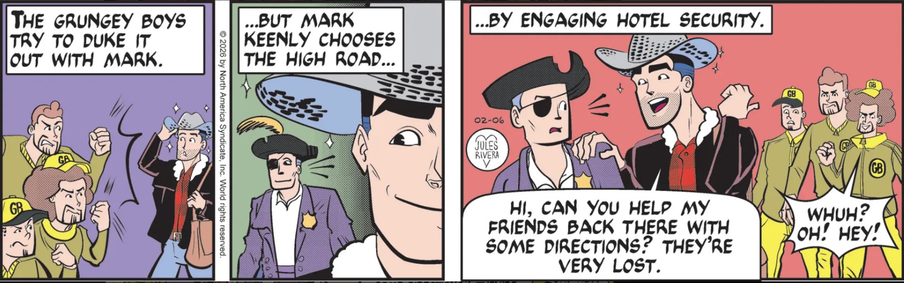 I’ll give Rivera some credit for Mark’s non-violent (if temporary) solution to this otherwise put-up confrontation. At the same time, I share the readers’ disappointment that Mark doesn’t just simply beat the crap out of these guys. And where is Cliff hiding, anyway? How come he isn’t backing Mark up? Some pal he is. If I was the snarky type, I might suggest that Cliff is likely upstairs helping Cherry settle into her room. However, there are other web sites that already indulge in snark like that! I like to think that we maintain a higher quality of self-indulgent doggerel here at The Daily Trail. I also like to think that I am 6 feet tall and look like George Clooney.