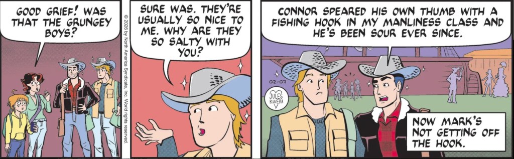 Let’s get into the story. Jules Rivera omitted the conclusion of yesterday’s face-off, so we’ll never know if the security guard was as reluctant to get involved as he looked, or if the Grungey Boys wanted to avoid the law and so quickly left. It seemed like it would have been a good opportunity for Rivera to get in some cheap laughs. Today we learned the likely reason why Cliff didn’t back up Mark against the Grungey Boys (panel 2). Does Mark think Cliff’s memory isn’t very good or did he forget Cliff’s own involvement in that doomed fishing class he mentions in panel 3? It might have produced a more effective panel to have Mark start off reminding Cliff of Connor’s accident and then show Cliff jumping in to finish the rest of the explanation, demonstrating that he did remember. A more dynamic panel results, though it would mean getting rid of the narration box.