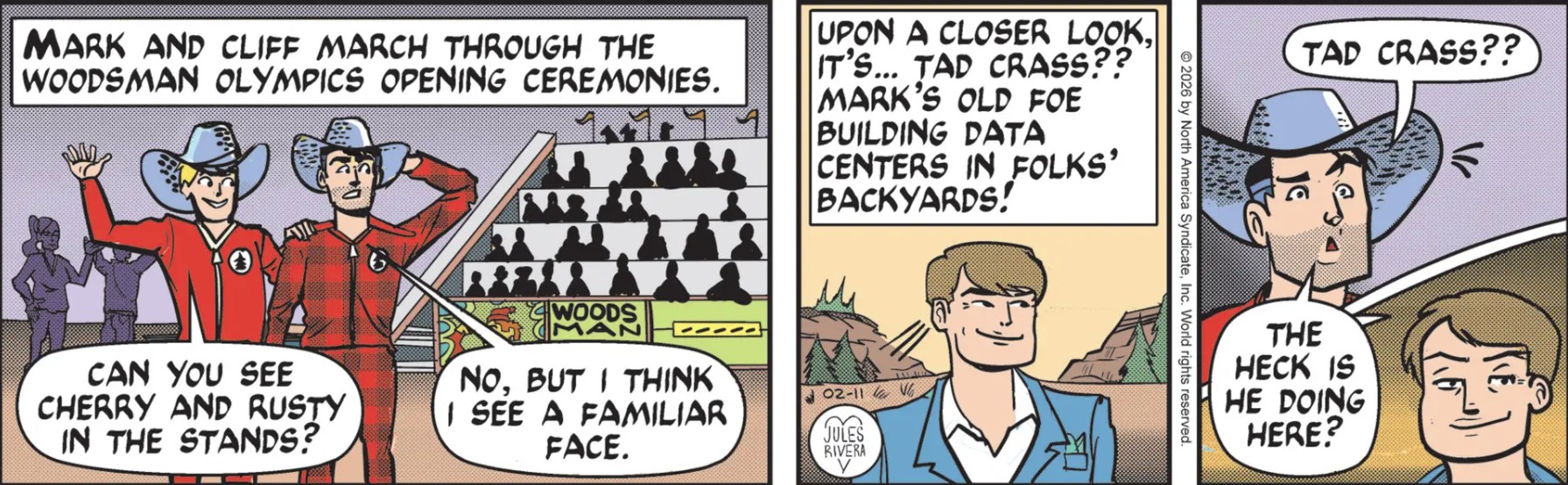 Well, we’re not seeing Cricket Bro; instead, it’s the reappearance of Tad Crass. For those of you who are relatively new to the strip or the blog, or who simply have poor memories, Tad Crass was the con artist who wrote a fake camper’s survival book that current Trail rival Connor purchased and tried to follow, resulting in him having a nervous breakdown in Lost Forest (“Rusty and the alien invasion”). Crass later showed up in person as owner of a company that tried to hide a data center in its back lot (“Horsin’ Around”). This is the new world Mark tends find himself in: con artists, fraudsters, and corrupt politicians. But no poachers, no arsonists, and no kidnappers.