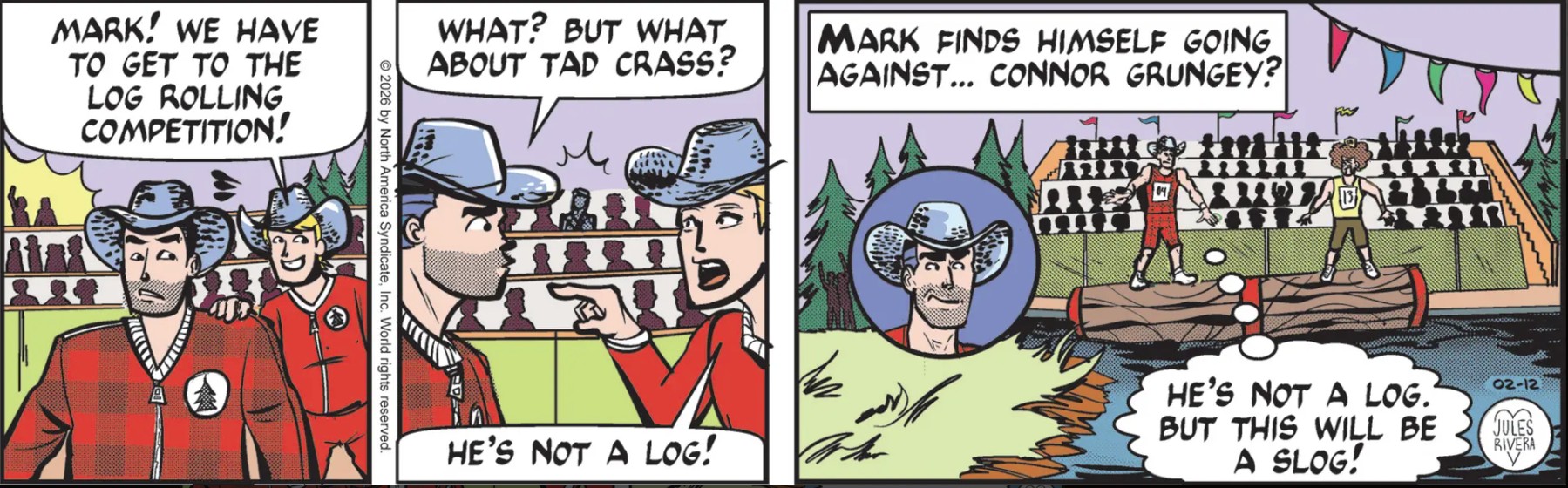 And how is it that only Cliff knows the Olympic events schedule? Weren’t they all briefed ahead of time? Didn’t Mark and Cliff even discuss their game strategy? At least he knows how to deliver a funny line. This is sure one odd Olympics. Perhaps you are wondering: Is this Woodsman Olympics really the point of this story? Maybe Mark intuited something more important, after all. Maybe Tad Crass is the nexus. Maybe he has been hawking a phony “How to Win the Woodsman Olympics” book. And maybe Connor—not the sharpest axe in the logging camp—bought Tad’s book and read it.