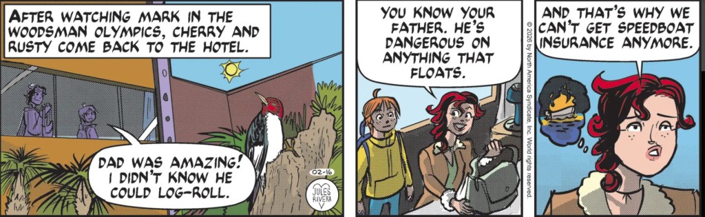 Art Dept. While the story content today is somewhat thin, the strip offers a visually more interesting set of panels. First, the tonal quality is unusual in its appearance. Usually there is none. Rivera rarely emphasizes volume or shading in figures or surroundings. Yes, there has been an increasing use of generic “shading” (e.g. the second panel on Saturday), though not usually linked to any object or light source. Today, you can see how shading is used to distinguish Mark and Rusty standing inside of a building (panel 1); or how Rivera employs shading to give a sense of solidity to Cherry’s and Rusty’s bodies (panel 2). In addition, Rivera uses shading to create shadows falling across the body, suggesting subtle images outside of our view. For example, the odd diagonal shadow across Cherry’s exposed sternum (panel 3) appears to be a shadow cast by that white diagonal brace in panel 1. However, Rivera kind of undercut the reality of her shadows by placing the sun behind the hotel.