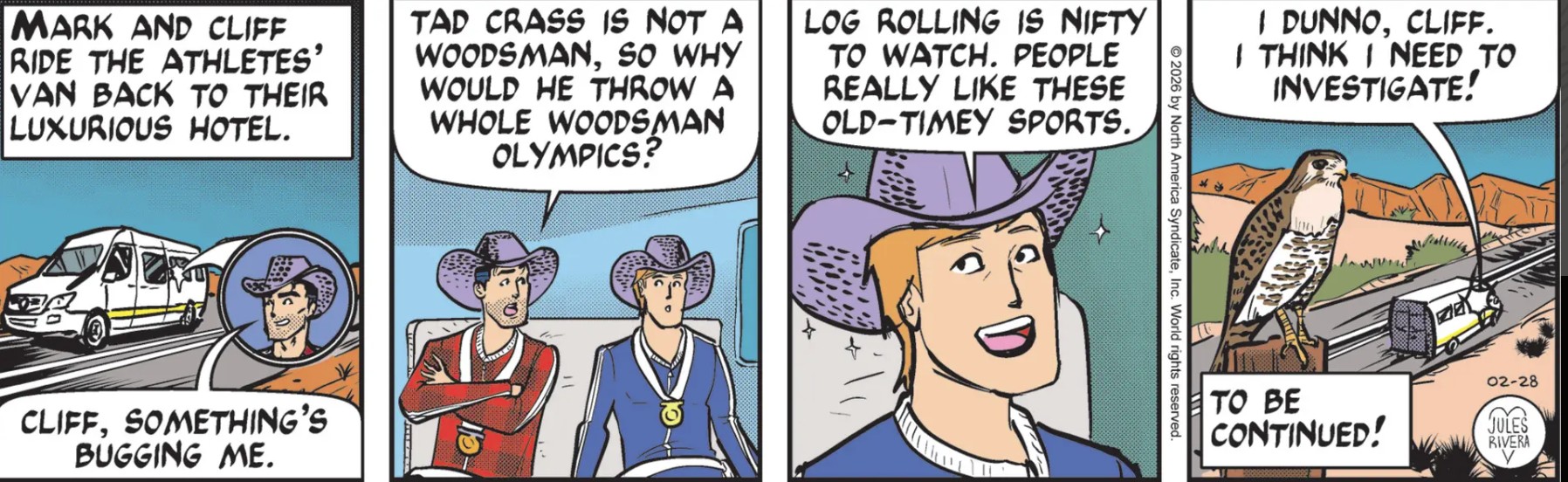 Art Dept. One thing I’ve started noticing is the appearance of sparkles or stars around the head of somebody speaking. Today, it is Cliff (panel 3); yesterday, it was Mark (also panel 3). In cartoon history, stars floating around a person’s head indicated that the person just got a good clobbering. This is different. So, if you have any ideas, let us know!