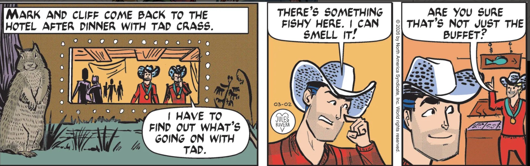 After a week of sometimes interesting artistic choices and experiments, Jules Rivera has returned to her standard stock-in-trade of presenting ill-formed figures and objects, barely defined settings, and dull panel layouts. Also noteworthy is the continual change in coloring of medals and ribbons, to say nothing of Cliff’s chameleon sweat suit.