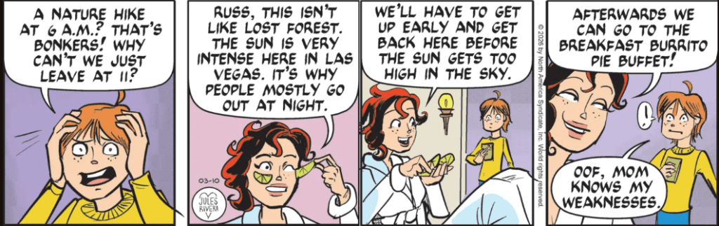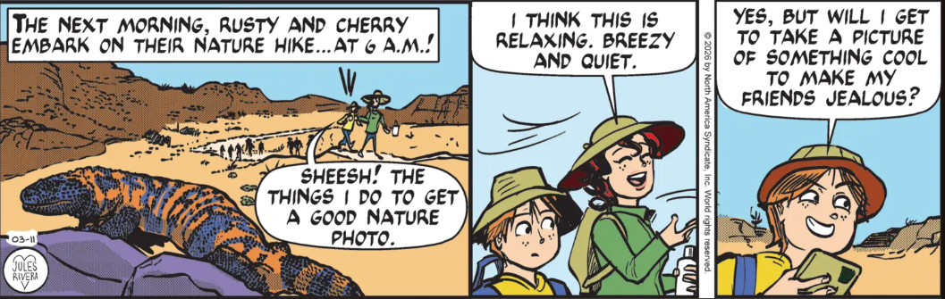 Well, maybe Rusty the Badger (check out his face in panel 4) could get a photo of something cool if he spent less time whining and more time looking. For example, will he see the Gila Monster beside him and Cherry? Do Rusty and Cherry see the anonymous crowd of people following behind them, as if these two are a manifestation of Forrest Gump?