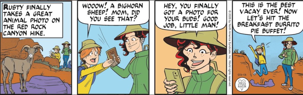 Does the hotel offer free rides to the canyon? Perhaps a hotel shuttle? It’s a bit far to take a Lyft. And speaking of lift, I doubt Rusty and Cherry got a lift from Mark, either. Say, I wonder where Mark and Cliff were last night, after they returned from their field trip. Cherry and Rusty don’t seem to be bothered by Mark’s absence. We’ve seen no evidence of familial or marital issues, so we must assume that there was a decision that this pseudo-vacation should be treated as if Mark is on assignment and they are on their own. Just as well, because had Mark tagged along, he would have found something to complain about or want to investigate, and there goes the day!