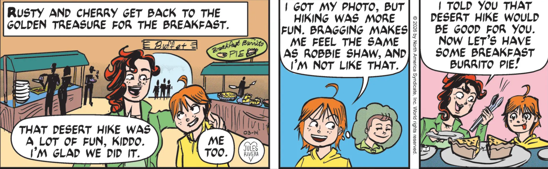 No, I’m referring to that drugged-out, acid-trip fourth panel. The harshness of the lines, Cherry’s aggressiveness, and Rusty’s expression are scary. When I first viewed today’s strip, I thought Rusty looked like he transformed into a character from the Walking Dead. It might not be a good idea to feed any burrito pie to the lad. Besides it’s probably about 2300 calories a slice.