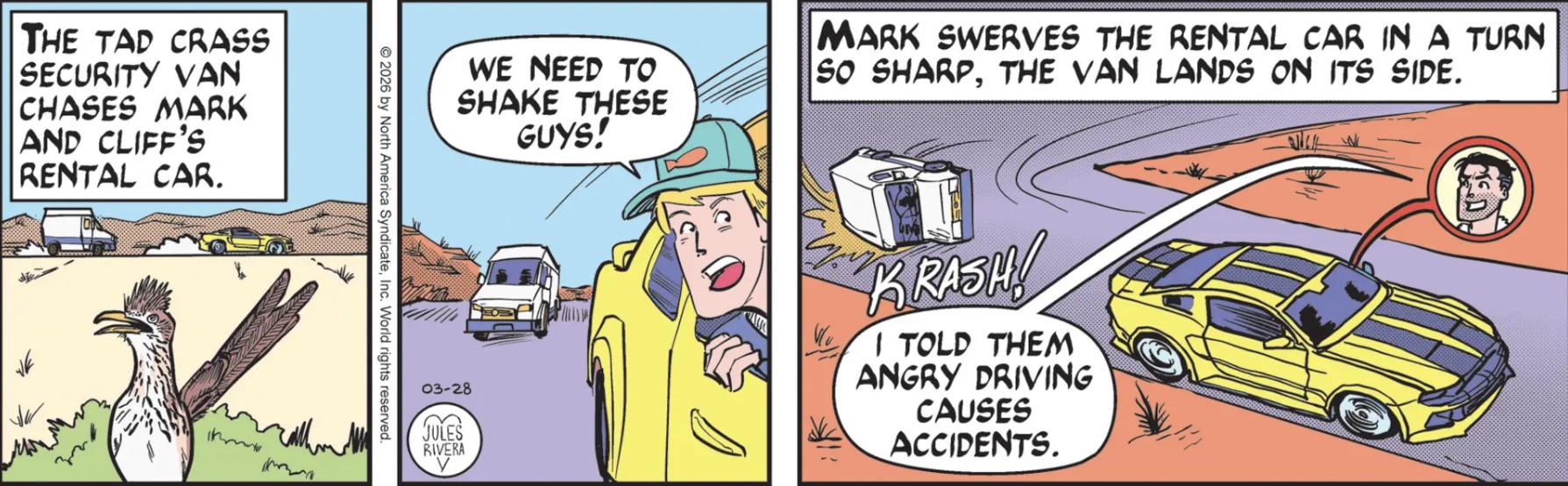 But I don’t understand how Cliff’s cap stays on his head when it is stuck out in the open like we see in panel 2. It would have to be so screwed down on his head that his hair would be sticking out sideways. I was also puzzled by Mark’s quip in panel 3. I looked back and didn’t see any advice Mark gave out on safe driving. Gosh, maybe he was just fibbing!? Anyway, I was hoping this chase would last a few more strips. It barely even deserves to be called a car chase.