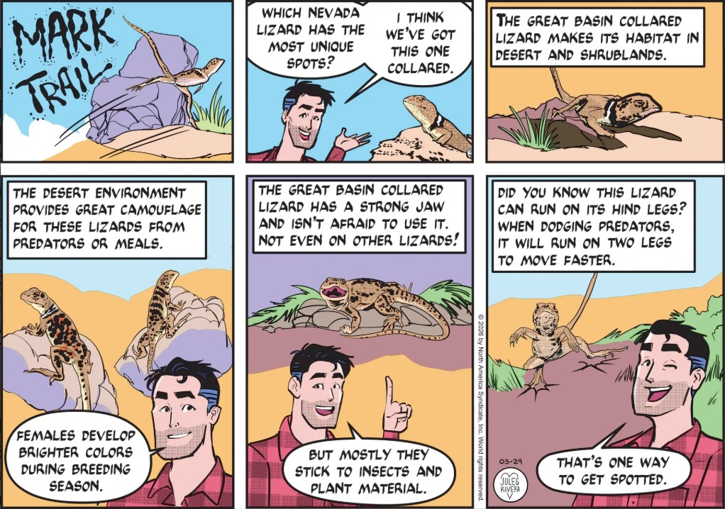 This lizard is also known by other names and exists in parts of several western states. One characteristic that may be difficult to illustrate successfully is the appearance of light-colored spots across the main body, while the tail may reverse the coloring of the skin and the spots. I’m guessing this is the reason for the “spots” around “Mark Trail” in the Title Panel. When the Roadrunner (seen in Saturday’s strip) is not avoiding Wile E. Coyote, it enjoys a good meal of Great Basin Collard Lizard.