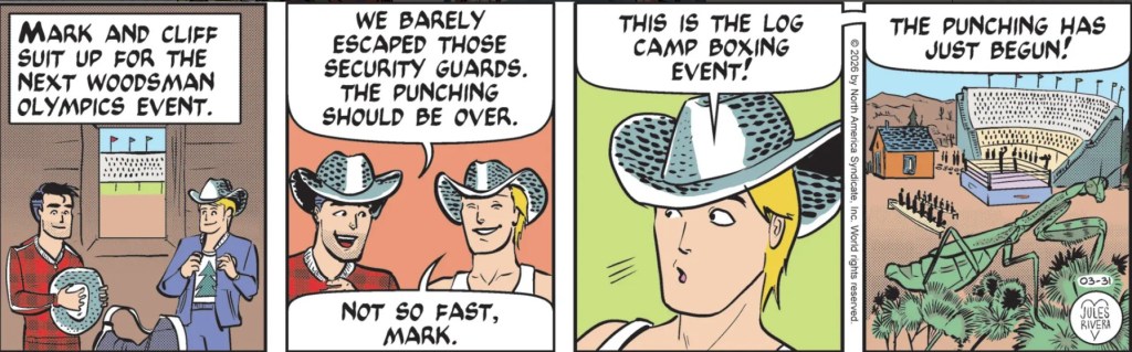 As far as why this boxing event exists in a woodsman olympics, it should be apparent that Rivera put Mark into this situation where she can trade off of (or make fun of) Mark and his “fists o’ justice.” It’s a simple way to inject more “action” into the plot, even if it is unrelated to the story; much like various action scenes in movies discussed in Saturday’s voluminous comments.