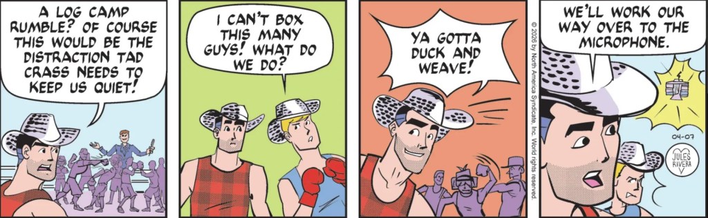 Now, I don’t quite get the conversation going on here. “A distraction to keep Mark quiet.” Huh? Are Mark and Cliff somehow under the impression that they must remain in this rink? I think not! But they don’t seem to know any better. Clearly, Mark must not care about winning the contest, so why worry about this sham fight?  All Mark has to do is step out of the rink and walk (or run) over to wherever the microphone Mark refers to is located (Note that the “image” in panel 4 shows a lectern with a mounted microphone; something we have not seen). Mark could also walk around to the other side of the rink, pull Tad’s feet out from under him (as happened to Cliff), and grab his microphone!