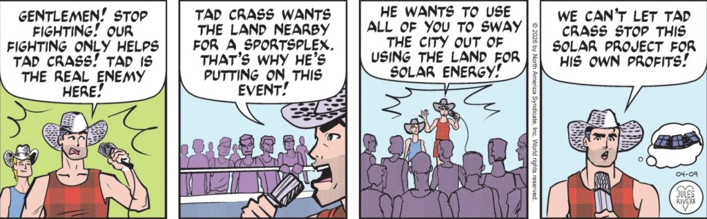 Okay, Clever Mark has figured out the connection between the sports complex and the Woodsman Olympics competition. But I don’t see how this plan would work (at least in the real world). A few hundred wood chopping fans is not going to sway the Las Vegas city council into thinking Tad Crass is worth the gamble. A bunch of sweaty guys playing with logs in a two-bit arena couldn’t possibly impress them. I get why this is a Mark Trail story, but the location is just wrong. It would a lot more sense if the story took place in some mid-sized city in Oklahoma or Idaho; a city looking to expand into the Big Leagues, so to speak.