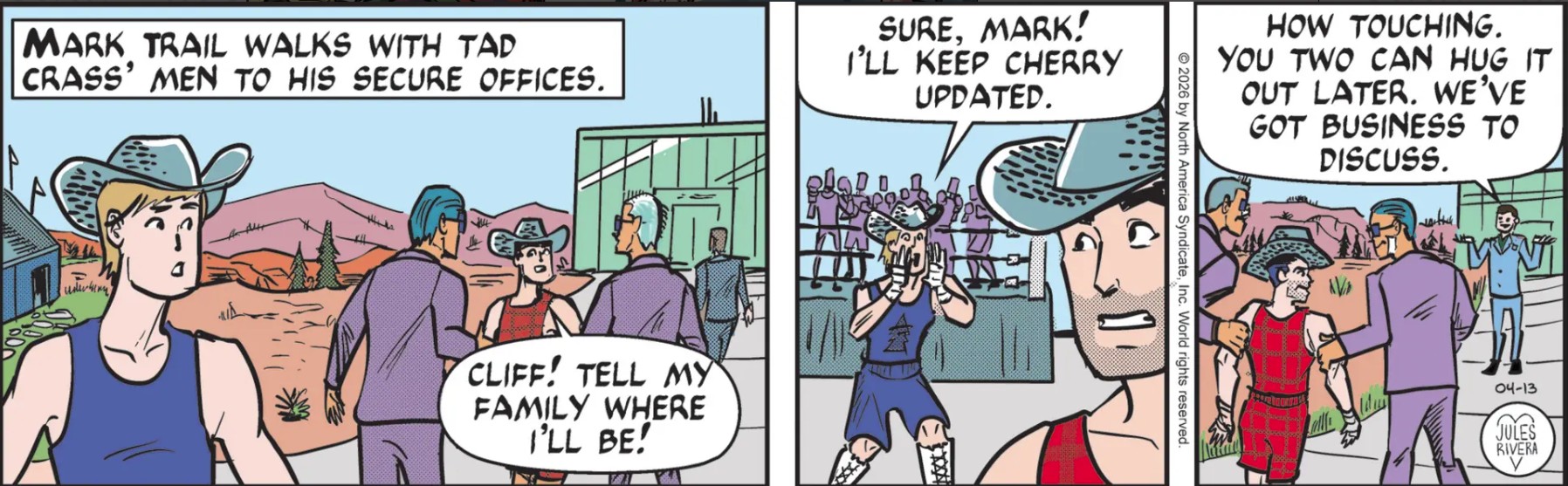 Art Dept. I’m envious of the clothing here, as they seem to keep changing colors over the days; except for Mark’s. It also looks like the guards switched positions between panels 1 and 3. Taken all together, it’s hard to not think Rivera is deliberately playing around to tweak the noses of her readers.
