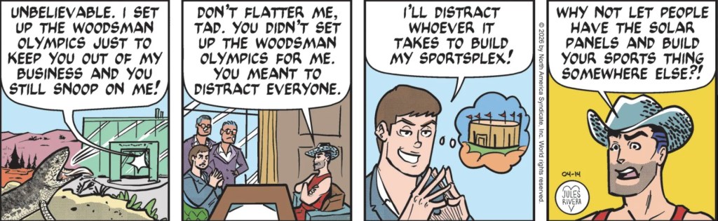 Sometimes it’s just hard to believe Mark Trail almost talks sense; even when it is right in front of us! No hysterics and no theatrics, he even sounds all grown up. On the other hand, Tad Crass makes little sense. In panel 1, Tad suggests that he created the Woodsman Olympics to distract Mark from his land scheme. Why does this make no sense? All he had to do was not invite Mark in the first place! But it’s like those early James Bond movies where the villain brings Bond into his lair and reveals his secret plans before trying to kill him. Tad wants to be the one opponent to beat Mark Trail.