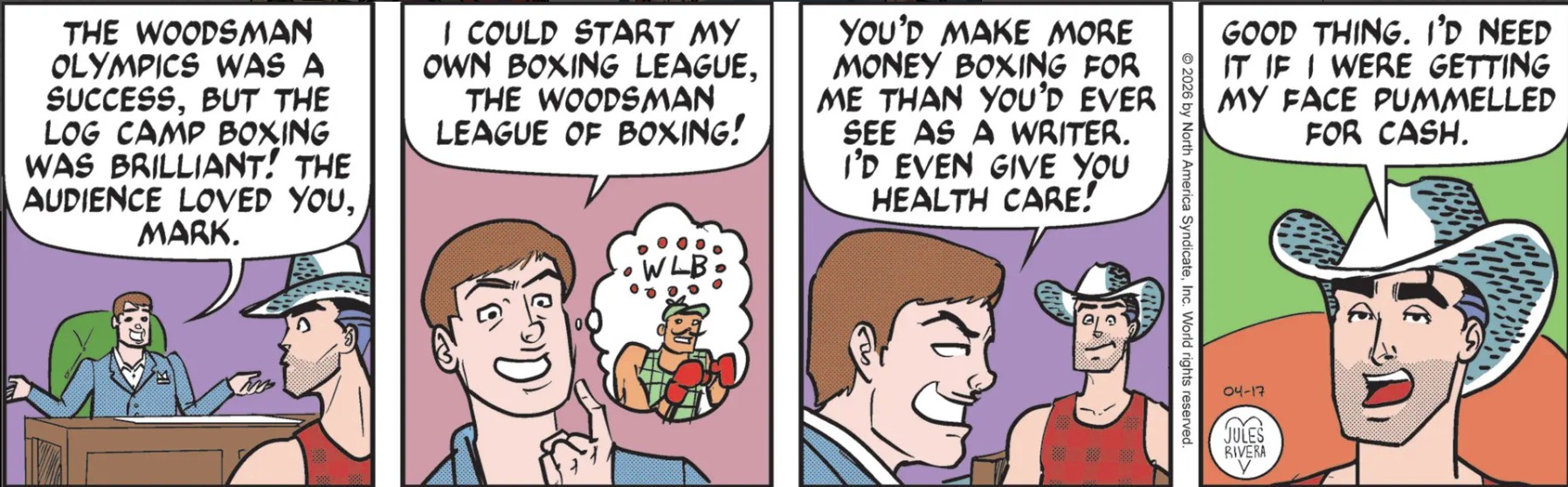 So far, Tad Crass is showing the kind of inspired off-the-cuff thinking and BS that is getting to be all too common these days. And he doesn’t seem to be making any headway. Jules Rivera gave Tad the “Simon Legree” sneer in panel 3 to make sure we understand who the Bad Guy is here. Maybe that explains the startled look on Mark’s face, as well. Mark returned to his expression of indifference in panel 4, which should get a rise out of Tad. No doubt, he will think it is a negotiating tactic and try to up the bargain.