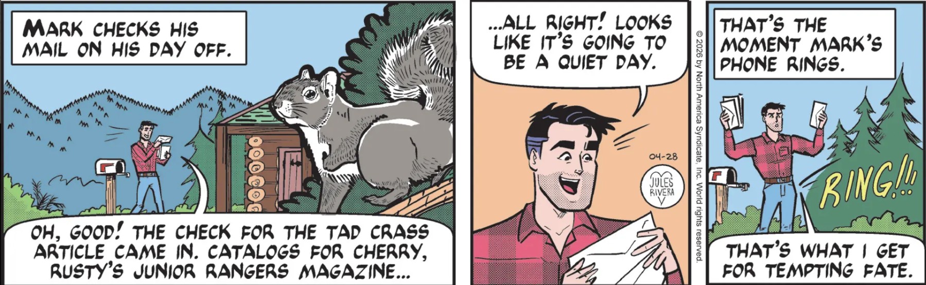 Well, the rest period didn’t take so long, after all. I reckon that the dinner last week took the place of the post-assignment nature walk. It appears that Jules Rivera is wasting no time in getting Mark back in the saddle. While I don’t mind putting myself out on a limb, I wouldn’t be surprised if this phone call had nothing to do with Bill Ellis, but was from somebody in his family. Better yet, it would be a hoot if it was a robocall or solicitation. I don’t know if Rivera has the guts or curiosity to devote a few panels to the idea, but who knows? It could be used to spur a new investigative adventure for Mark.
