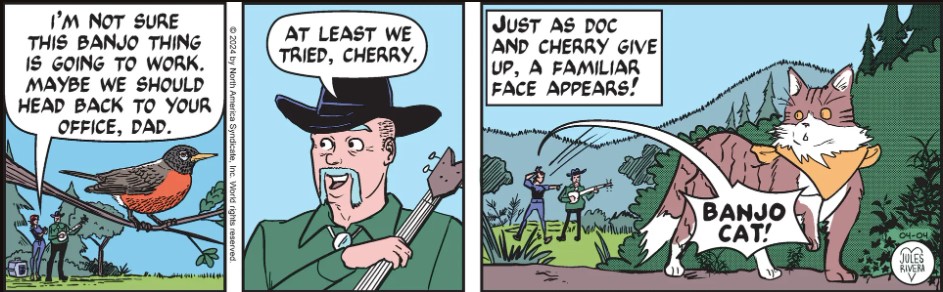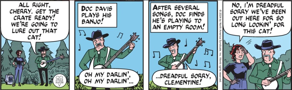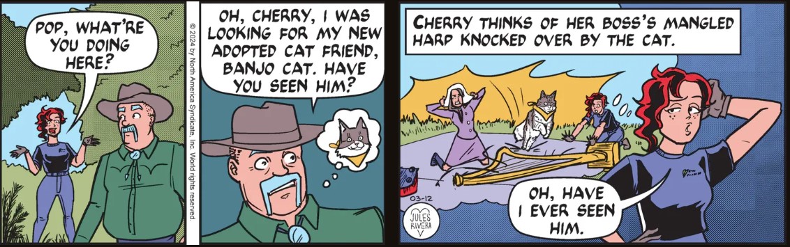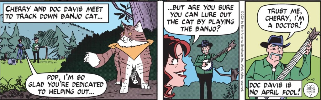 Of course not! In Rivera’s Trailverse, villains are truly cartoon stereotypes manifestly incompetent or mushy inside. Rivera is the latter type. Perhaps in gratitude for their détente, Banjo Cat went up on its hind legs and plucked feline arpeggios on Violet’s harp. Violet, Cherry, and Doc Davis looked on and all had a nice TV episode-ending laugh.