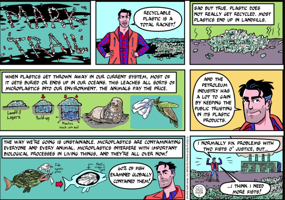 I’m sure most of you have heard or read the discussions about the failure of plastic recycling and the dangers of plastic pollution in the seas. So this is a decent-enough summary for a Sunday strip. If we are clever enough to create so many useful materials out of petroleum we sure should be able to figure out how to clean this stuff up and begin manufacturing plastics that do not become “forever pollution.”