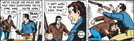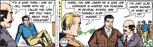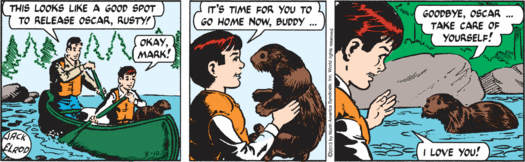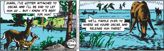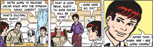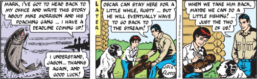 The cruelty of Nature is well documented, but the cruelty of Mark Trail, Man of Nature, retains its power to shock. Blissed-out Rusty nurses his otter and dreams of fishing, but mere days from now he will have neither otter, nor fishing, nor any last shred of hope. Mark just twists the knife, while Andy’s mind is all on dinner. Say — maybe they’ll have fish!
