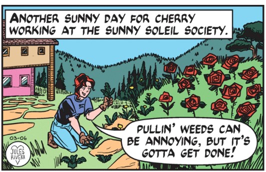 After the nighttime storm, Cherry showed up at the Sunny Soleil Society the next morning with Violet, only to discover pools of water on the floor inside the house. Somehow, water also got onto Violet’s work desk! Is there a leaky roof, too? Well, Violet acted as if she had no idea that there could be bad consequences to a concrete driveway, in spite of Cherry’s earlier warnings. Cherry volunteered to help clean up, issuing an odd warning about the (very remote) possibility of spadefoot tadpoles showing up, presumably to lay eggs in the pools of water. Somehow, this flooding disaster was supposed to have made Violet more sensitive to Nature, the Earth (e.g., Earth Day), and Conservation.
