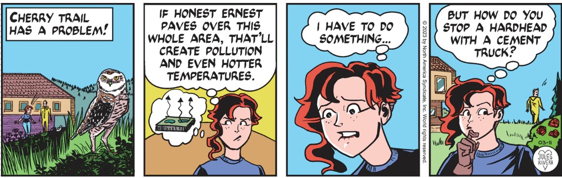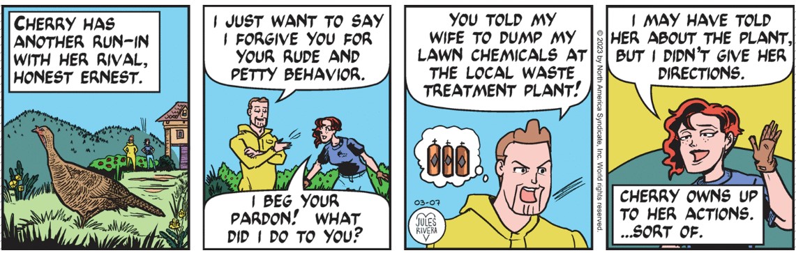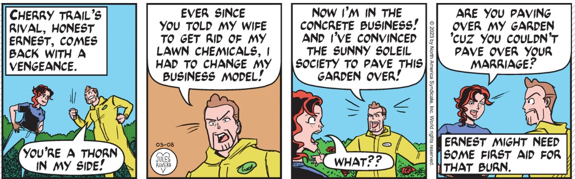 This week should have featured Cherry and her concrete adventure. We got to it, but not until Thursday. The strips for Monday-Wednesday were devoted to Mark and Cherry trying to share an intimate moment sitting out a nighttime storm. Normally, such lovey-dovey events appear after completed adventures. In fact, it originally seemed that Cherry’s concrete driveway story was done and buried under the concrete when Violet Cheshire went ahead with plans to lay a concrete driveway, using the services of Honest Ernest. Of course.