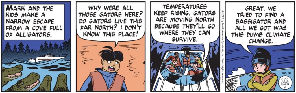 We’ve been here before. Rivera did a Sunday strip back on June 6, 2021 about mountain lines (aka pumas) in general, but did highlight P-22. Well, today’s nature talk focuses exclusively on the now-deceased mountain lion. But referring to the animal as “Hollywood’s Best Leading Man” is misplaced, owing to the biological impossibility, even if the comment was meant as an innocent pun. “Hollywood’s Coolest Cat” might have been a better moniker.