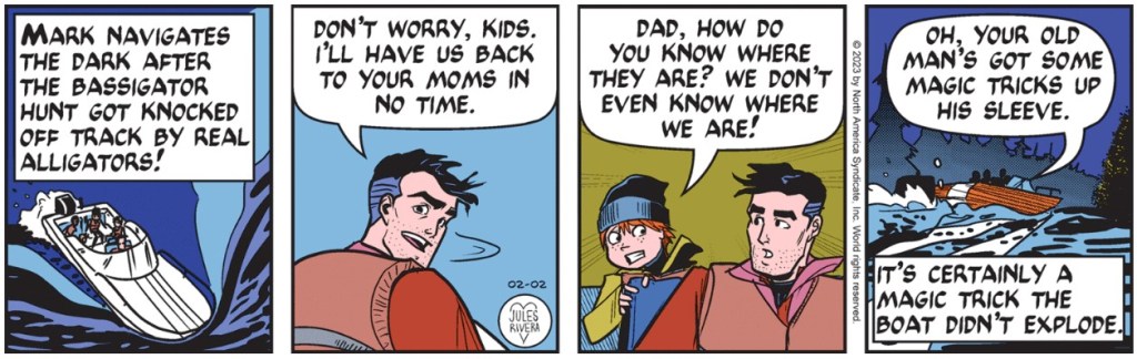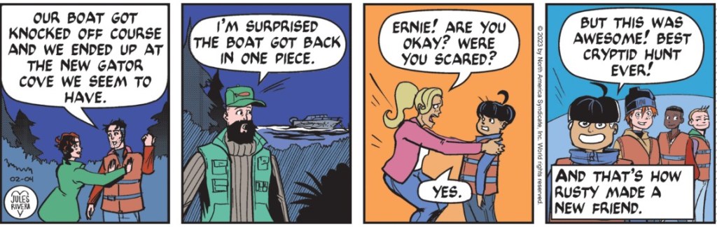 Is this the end of Rusty’s second (failed) cryptid hunt adventure? I’m guessing it is, except for maybe a few more days to wrap up loose ends. But wait! Mark Trail stories rarely wrap up loose ends. In fact, loose ends form a standard part of almost every Mark Trail story, going back for years. I think most Trailheads are still wondering whatever became of Tricky Dicky, I mean Dirty Harry, er, Dirty Dyer. Will Rivera resurrect him some day? Probably not, since Dirty was a more serious bad guy than the goofball villains that inhabit Jules Rivera’s version of The Trailverse. And speaking of loose ends, I’m surprised we don’t see more of Kelly Welly. I really thought Rivera would latch on to Kelly and give her a more prominent role where she could hold her own instead of always winding up as Mark’s foil.