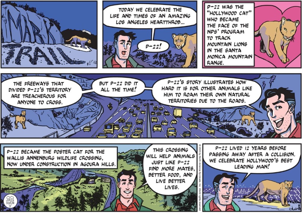 So, why P-22 again? Turns out that P-22 was struck by a vehicle last November as it tried to cross a highway in search of food. He was later captured by authorities and examined. Veterinarians noted that, in addition to damage from the collision, his advanced age, infirmities, and debilitating ailments (e.g., kidney disease) led to the decision to euthanize him this past December. Comic strips are written several weeks, if not months, in advance, so Rivera wrote this shortly after P-22’s death.