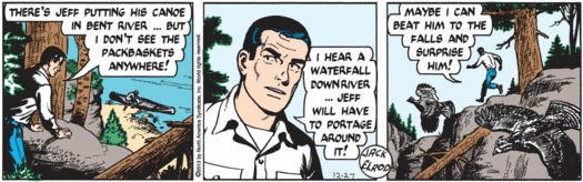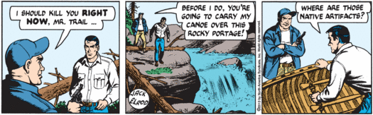 Of course, Mark’s hungry! He hasn’t eaten in weeks!! Poor guy! Why, his jeans are about to fall off his withering frame. While Doc and Cherry have been enjoying the hospitality of Ed Dunlap, Mark has been subjected to all manner of incarceration and torture! My and how fast the Wheels of Justice turn in the Trailverse! Jared’s in jail? You mean maybe he is being held as a person of interest pending his indictment hearing? And there’s Ol’ Jeff Baucom! Folded like a cheap tent! Still tied up and leaning against the house in the corner of the first panel. I almost didn’t see him! Makes me wonder if Rusty has been hiding in the corners all the while, maybe emitting muffled cries for validation and love…