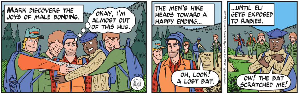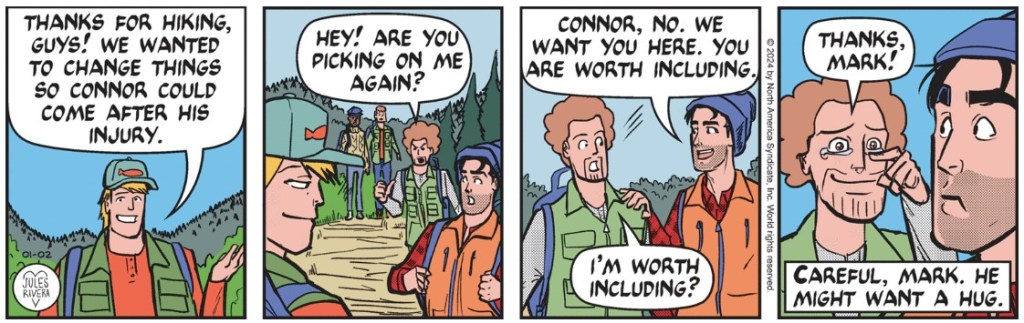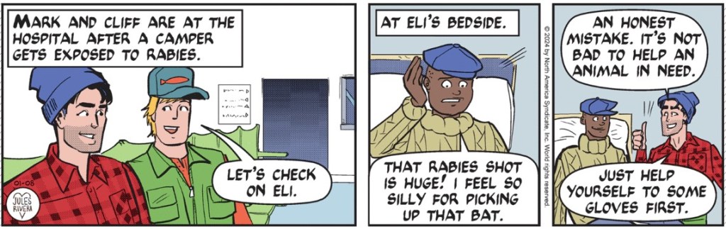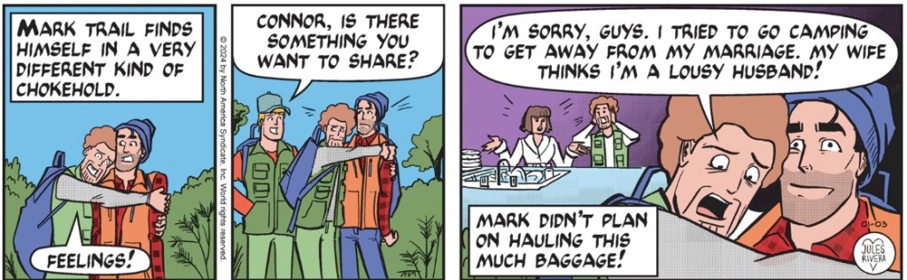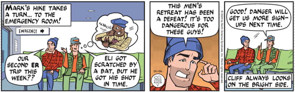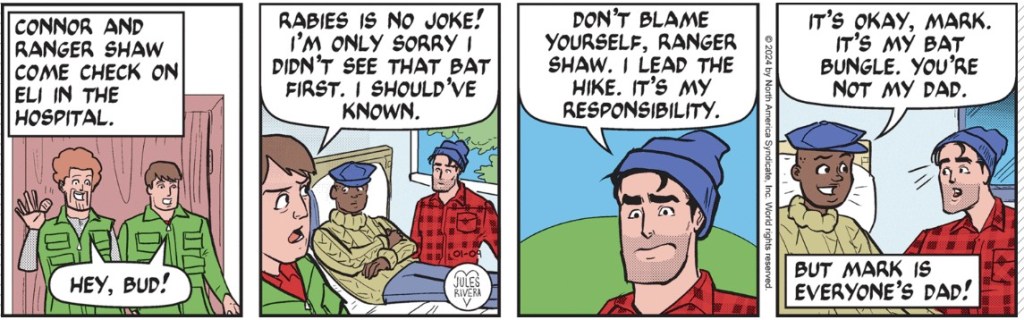 Art Dept. A crowd of commenters (well, at least one) remarked on a noticeable improvement in the artwork, specifically the fish and water scenes that excluded people. I concur. I also noticed a marked improvement (or reinvigoration) in the drawings of Mark’s face, especially close-ups and mid-range views. I’m thinking that Rivera may have upgraded her model sheets for Markey. We’ll have to see how all of this plays out.