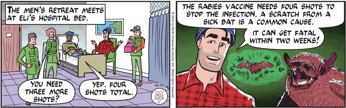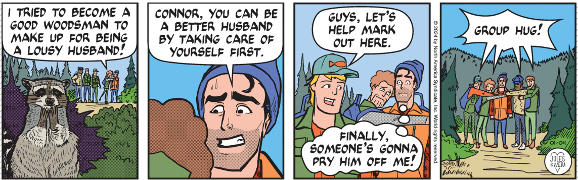 That aspiration floated for about 30 seconds then sunk to the bottom of the river when Mark got a call from Bill Ellis—on the verge of apoplexy—concerning a wild horse rampage taking place somewhere (presumably out west), but needing Mark’s personal onsite attention. One might assume that, as the managing editor of a publishing empire consisting of several magazines, Ellis would have more than one reporter on call, if not at least one reporter living somewhere in the western states who is more familiar with—and closer to—those crazy wild horses. But then again, the name of this strip is Mark Trail, not Hopalong Cassidy. So I’m afraid (I’m really afraid!) Mark will once again be flying out to some western location. Let’s hope he learned his lesson earlier and does not wear his embarrassing “western” Square Dance costume to the job!